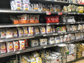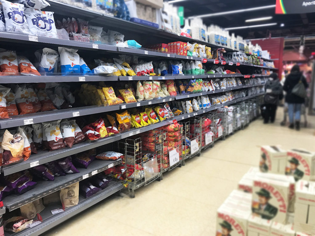 棚の長さは20mくらいあるでしょうか?棚一杯にポテトチップスが陳列されています。ここがスナック菓子のコーナーです。8割がポテトチップス。沢山種類がありそうで、実は同じ物を3~4列ずつ並べています。塩味が最も多く、その他ポピュラーなのは、トマト味、パプリカ辺りです。ショウガ、BBQ、ペッパー等もあります。イタリア製、他のEU製、アメリカブランドとメーカーは様々。