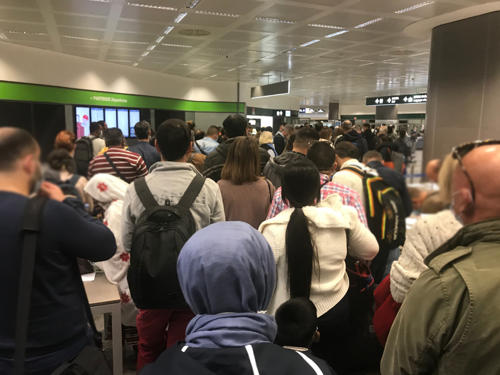 カタール航空のチェックインカウンターには既に列が出来ていました。チェックインの手続きが一人一人に非常に時間が掛かります。イタリアからカタール経由での日本行きは、日本国籍者は全く問題ありません。しかし、国籍に依っては書類が揃っていないとカタールでのトランジットが認められない国もある様です。(カタールから他の国へ)チェックインで登場拒否される人も見かけました。登場拒否の経験はありませんが、それに近い事は何度かあり、白熱した交渉を経験した事があります。だから、搭乗出来ない人の気持ちもわかります。大きな荷物を抱えて途方に暮れている様子でした。