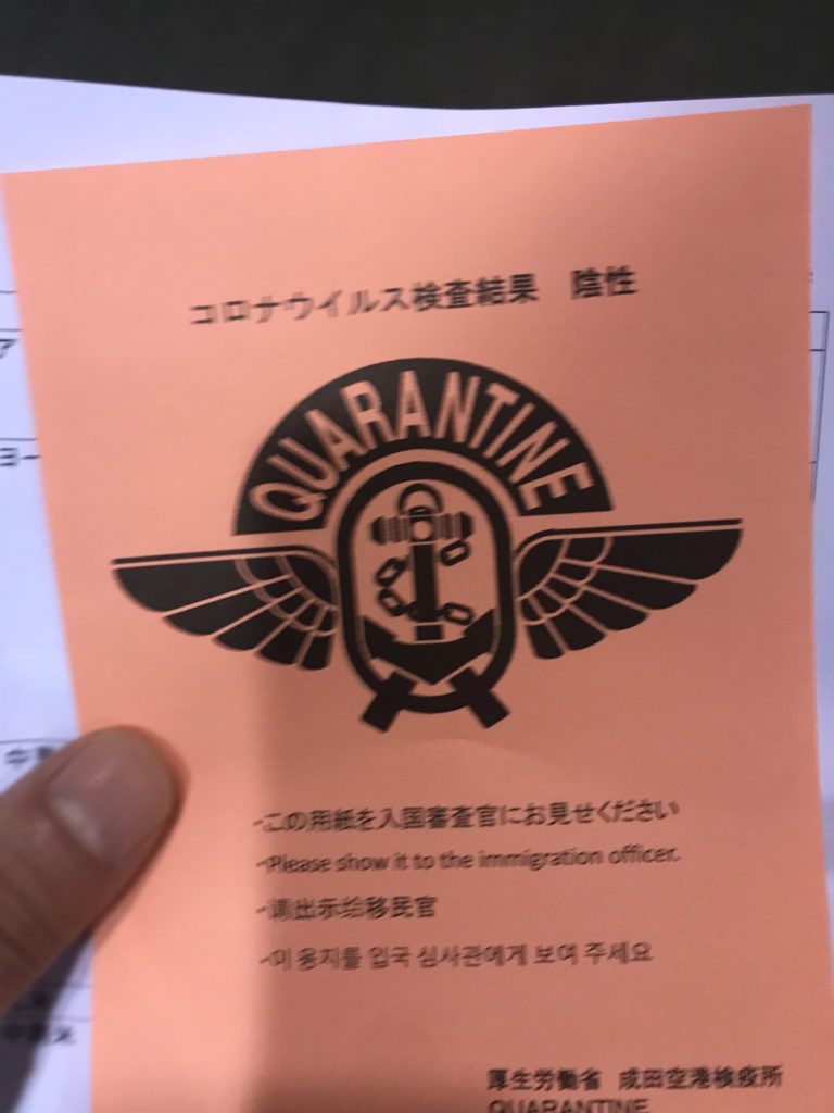 成田到着です。10月31日現在、PCR検査ではなく検体検査を行っていました。PCR検査だと結果が出るまでに1日以上掛かっていましたが、検体検査だと到着‐検査‐結果待ち‐出口 で約2時間でした。通常だと到着から荷物をピックアップして1時間位は掛かりますので、それを考えると検査して結果まで、そして出るのに2時間は早いと思いました。この後は、公共交通機関は使用出来ない上に14日間の自主隔離があります。結果陰性の↑の紙をもらう際にそられの事と”毎日、メールで体調を聞きます”と言われました。”流石に日本は厳しいな”ってな感じですね。(メールが来たのは一度だけでした。笑)
