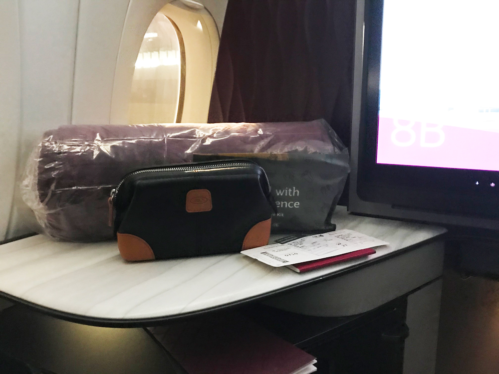 アメニティーキッドも充実しています。ブランケットは、中綿でキルティングです。非常に温かったです。パジャマもありました。パジャマに着替えると心までホッとします。今まで、色々なairlineのビジネスクラスを利用した経験がありますが、シートは、カタール航空がやはり一番ですね。