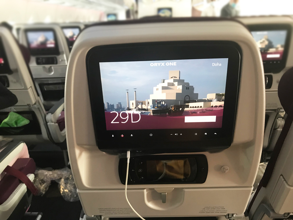 出発は、定刻通りでした。カタール航空 ドーハ経由成田行きは、エアバスA350-1000です。エコノミークラスに搭乗しました。液晶や機材も新しい感じでした。