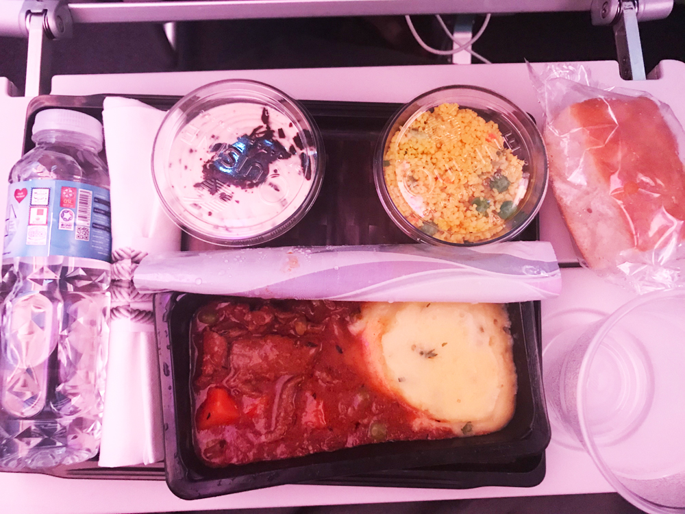 食事は1回とスナックが1回でます。↑のビーフシチュー風ですが、とても美味しかったです。シートは広めだし食事も美味しい。”カタール航空、こりゃ、とてもいいな” この時点では、そんな印象でした。(食事は、がっつり食べる人には量的に少な目かもしれません。